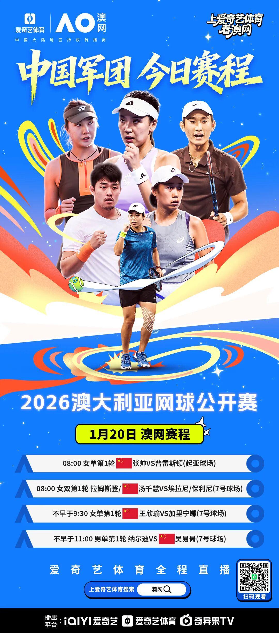 北京时间1月20日,2026澳大利亚网球公开赛第3日比赛将在墨尔本公园全面打响。爱奇艺体育将继续为您全程直播所有精彩对决。中国球员王欣瑜、老将张帅携手资格赛突围的吴易昺出战首轮。卫冕冠军也将登场!罗德拉沃尔球场凯斯率先出战,夜场辛纳坐镇。两届赛会冠军大坂直美最后出战。罗德·拉沃尔球场8:30 女单第1轮 奥利尼科瓦vs凯斯不早于10:30 男单第1轮 谢尔顿...